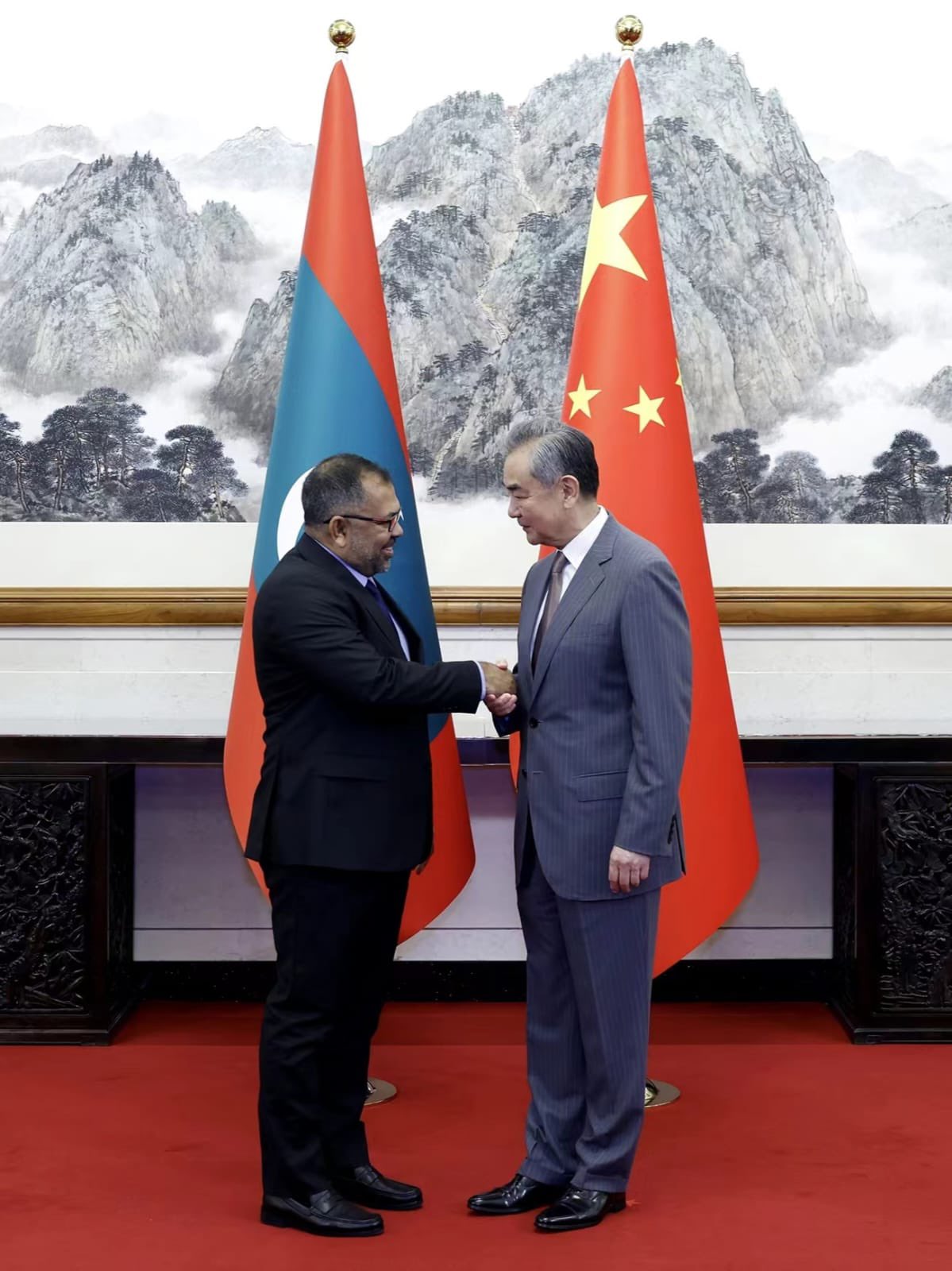 ޗައިނާގެ ސްޓޭޓް ގެސްޓް ހައުސްގައި މިއަދު ބޭއްވި މި ބައްދަލުކުރެއްވުމުގައި، ޗައިނާގެ ފޮރިން މިނިސްޓަރ ވަންގ ޔީ ވަނީ ފޮރިން މިނިސްޓަރ ޒަމީރު އަދި އަރިހުގައި ވަޑައިގެންނެވި ވަފުދަށް ވަރަށް ހޫނު މަރުޙަބާއެއް ދަންނަވާފަ އެވެ. މިނިސްޓަރ ޒަމީރު ވަނީ ރައީސުލްޖުމްހޫރިއްޔާ ޑރ. މުޙައްމަދު މުޢިއްޒުގެ ފަރާތްޕުޅުން ޗައިނާގެ ރައީސް އަދި ރައްޔިތުންނަށް ހެޔޮއެދުންތައް އަރިސްކުރައްވައި، ރައީސުލްޖުމްހޫރިއްޔާ ޑރ. މުހައްމަދު މުއިއްޒު ޗައިނާގެ ރައީސް ޝީ ޖިންގޕިންގ އަށް ފޮނުއްވެވި ދެ ސިޓީފުޅެއް، އެ މަނިކުފާނަށް ރައްދުކޮށްދެއްވުމަށްޓަކައި ޗައިނާގެ ޚާރިޖީ ވަޒީރުގެ އަތްޕުޅަށް އަރުވާފަ އެވެ.