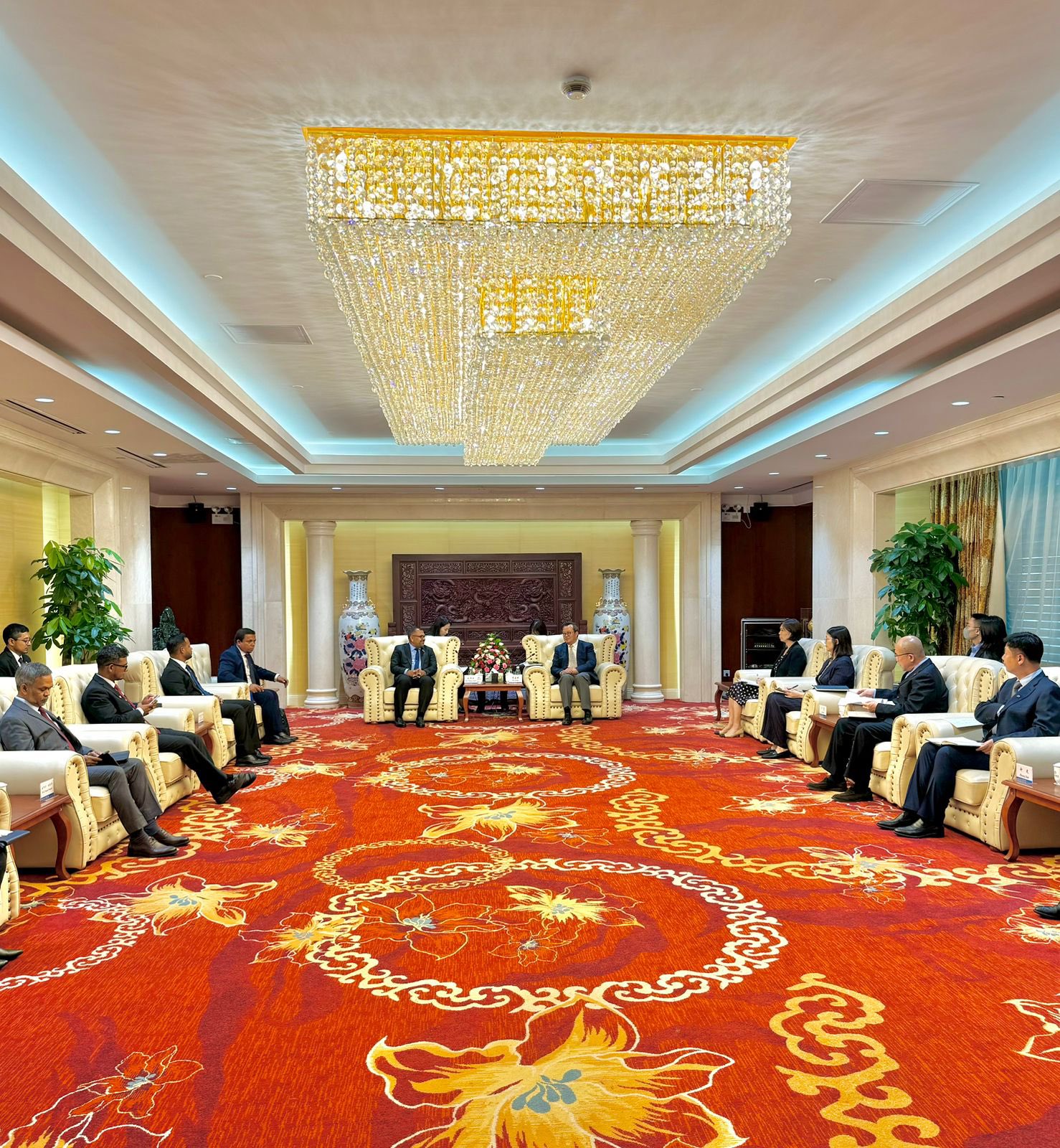 މިކަން ހިއްސާކޮށްފައިވަނީ، ޗައިނާގެ ޚާރިޖީ ވަޒީރު ވޮން ޔީގެ ދައުވަތަކަށް ދިވެހި ރާއްޖޭގެ ޚާރިޖީ ވަޒީރު މޫސާ ޒަމީރު ޗައިނާއަށް ކުރައްވަމުންގެންދަވާ ރަސްމީ ދަތުރުފުޅުގެ ތެެރެއިން، މިއަދު ޗައިނާގެ އެކްޒިމް ބޭންކުގެ ޗެއަރމަން ވޫ ފުލިން އާއެކު ބޭއްވެވި ބައްދަލުވުމެއްގަ އެވެ.