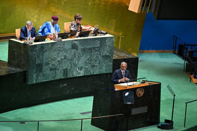 ރައީސުލްޖުމްހޫރިއްޔާ މިހެން ވިދާޅުވީ އދ.ގެ މައި އިދާރާގެ އާންމު މަޖިލީހުގެ ހޯލުގައި ކުރިޔަށްދިޔަ ސަމިޓް އޮފް ދަ ފިއުޗަރ ހުޅުވުމުގެ ބައްދަލުވުމުގައި ވާހަކަފުޅު ދައްކަވަމުންނެވެ.