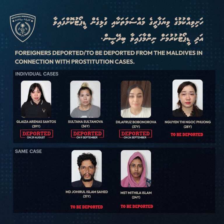 މިއޮޕަރޭޝަންގެ ތެރެއިން މިކަމުގައި ޝާމިލްވާ ބިދޭސީ 05 އަންހެނުންނާއި އެޖެންޓެއްގެ ގޮތުގައި މަސައްކަތް ކުރަމުންދިއަ ބިދޭސީ ފިރިހެނަކު އިމިގްރޭޝަން ބެލުމުގެ ދަށަށް ގެނެސްފައިވާ ކަމަށާއި އޭގެ ތެރެއިން ތިން މީހަކު މިހާރު ރާއްޖެ އަނބުރާ ނާދެވޭ ގޮތަށް ޑީޕޯޓު ކޮށްލާފައިވާ ކަމަށް ވެސް އެއޮތޯރިޓީން ބުނެފައިވެ އެވެ،