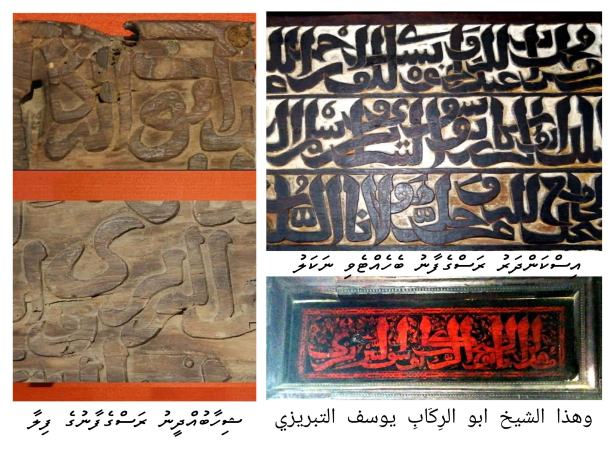 ”Unfortunately, the line where the name of the converter is mentioned has been severely damaged on the board so that we cannot take the reading al-tabrizi for granted as it stands. A comparison of a present day photograph with the reproduction published by H.C.P. BELL in the 1940ies make it clear, however, that we have a mixed spelling here, sayh galal yusuf al-tabri being written in Arabic, and the final syllable of the name , -zi together with the genitive ending, -ge, being added in Dhives akuru. The decisive point in this reading is the aksara zi, of course, for it alone can prove that we have no barbari here, given that there are no punctuation marks visible in the Arabic part of the word.“