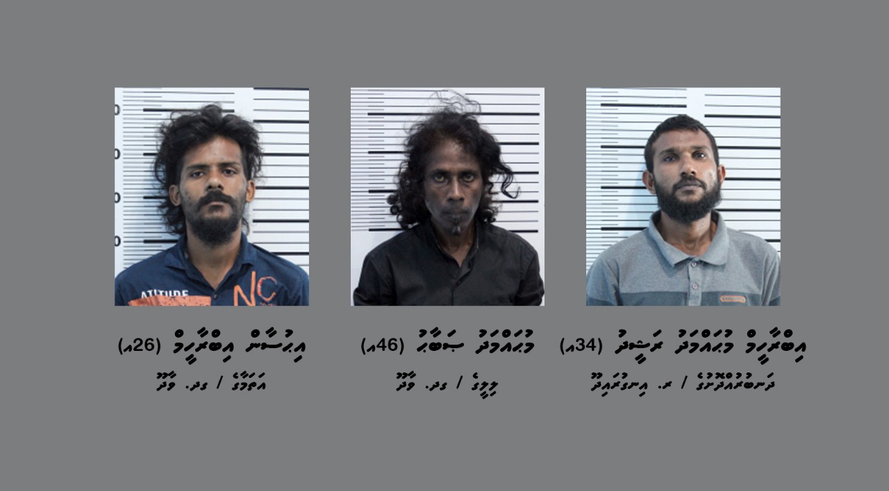 ފުލުހުން ވަނީ މިމައްސަލަ އާއި ގުޅިގެން ހައްޔަރުކޮށްފައިވާ މީހުންގެ ވަނަވަރު އާއްމުކޮށްފައެވެ. އެގޮތުން މި މައްސަލައާއި ގުޅިގެން ހައްޔަރު ކޮށްފައި ވަނީ އުމުރުން 26 އަހަރުގެ ގދ. ވާދޫ، އަތަމާގޭ، އިހުސާން އިބްރާހިމް އާއި ހަމަ އެރަށު، އުމުރުން 46 އަހަރުގެ ލިލީގެ، މުހައްމަދު ސޮބާހު އާއި އުމުރުން 34 އަހަރުގެ ރ. އިނގުރައިދޫ، ދަނބުރުއްދަށުގޭ، އިބްރާހިމް މުހައްމަދު ރަޝީދުއެވެ.