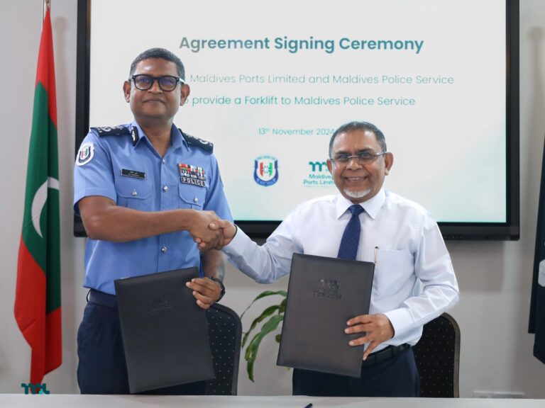 މޯލްޑިވްސް ޕޯޓްސް ލިމިޓެޑް (އެމްޕީއެލް) އިން މޯލްޑިވްސް ޕޮލިސް ސާވިސްއަށް ފޯކް ލިފްޓެއް ފޯރުކޮށްދިނުމާއި ގުޅޭ އެމް.އޯ.ޔޫ އެއްގައި ސޮއިކޮށްފިއެވެ.
