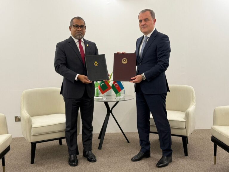 ޚާރިޖީ ވަޒީރު ޑރ. އަބްދުﷲ ޚަލީލް މިއަދު އަޒަރުބައިޖާންގެ ޚާރިޖީ ވަޒީރު ހިޒް އެކްސެލެންސީ ޖޭހުން ބައިރަމޯވް އާ ބައްދަލުކުރައްވާ، ރާއްޖެއާއި އަޒަރުބައިޖާންއާ ދެެމެދު މުހިންމު ދެ އެއްބަސްވުމެއްގައި މިނިސްޓަރ ސޮއިކޮށްފިއެވެ.