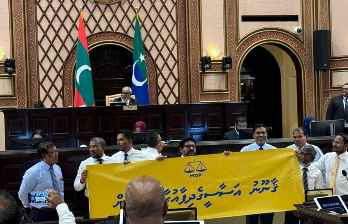 ގާނޫނު އަސާސީ އިސްލާހު ކުރުމަށް ސަރުކާރުގެ ފަރާތުން ހުށަހަޅާފައިވާ ބިލާ ގުޅިގެން އިދިކޮޅު އެމްޑީޕީގެ މެންބަރުން މަޖިލިސް ތަޅުމުގައި އިހުތިޖާޖު ކޮށްފިއެވެ.