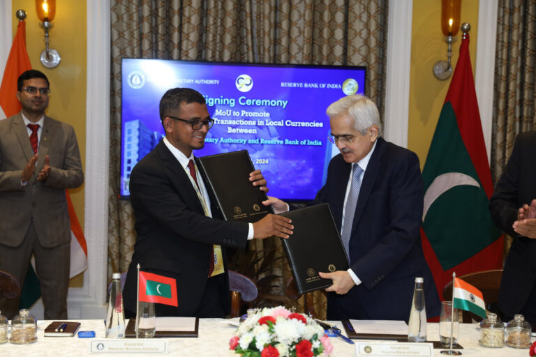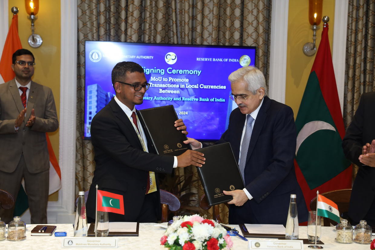 ރާއްޖެ އާއި އިންޑިއާ އާއި ދެމެދު ކުރެވޭ ފައިސާގެ މުއާމަލާތްތަކުގައި އެ ގައުމެއްގެ އަމިއްލަ ފައިސާ ބޭނުންކުރުމާ ގުޅޭ ގޮތުން މޯލްޑިވްސް މަނިޓަރީ އޮތޯރިޓީ (އެމްއެމްއޭ) އާއި ރިޒާވް ބޭންކް އޮފް އިންޑިއާ (އާރުބީއައި) އިން އެމްއޯޔޫއެއްގައި އިއްޔެ ސޮއިކޮށްފިއެވެ.