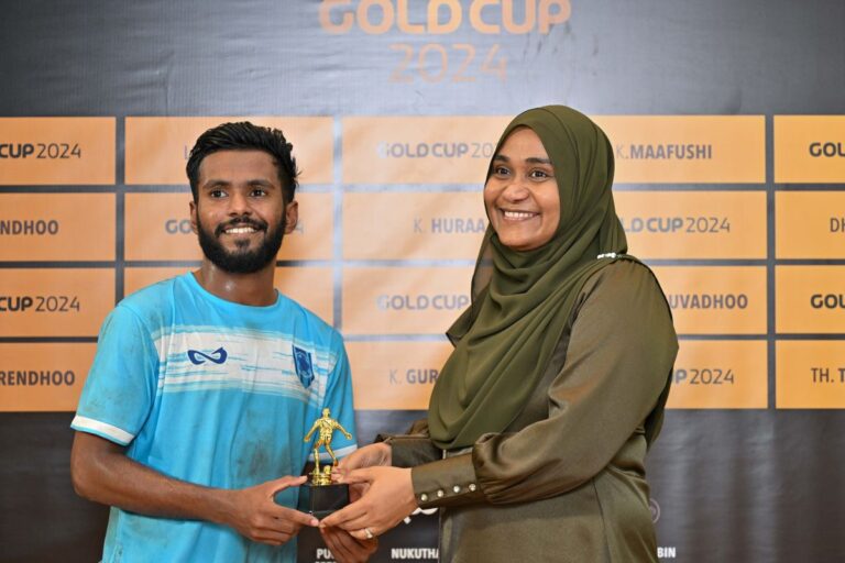 މެޗަށްފަހު ”މޭން އޮފް ދަ މެޗް“ އަށް ހޮވުނު ކުޅުންތެރިޔާއަށް ޓްރޮފީ ޙަވާލުކޮށްދެއްވީ ރައީސުލްޖުމްހޫރިއްޔާގެ އަނބިކަނބަލުން މެޑަމް ސާޖިދާ މުޙައްމަދެވެ.