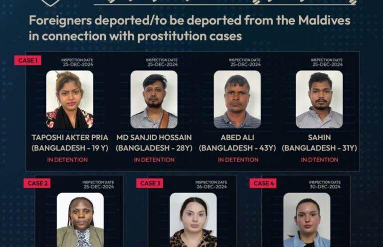 އިމިގްރޭޝަނުން މި މައްސަލައާ ގުޅޭގޮތުން މިފަހަރު އަތުލައިގެންފައިވަނީ ބަންގްލަދޭޝަށް ނިސްބަތްވާ ތިން ފިފިހެނަކާއި، ބަންގްލަދޭޝް އަންހެނަކާއި، ރަޝިއާގެ ދެ އަންހެނަކާއި ޔުގަންޑާއަށް ނިސްބަތްވާ އަންހެނެކެވެ.