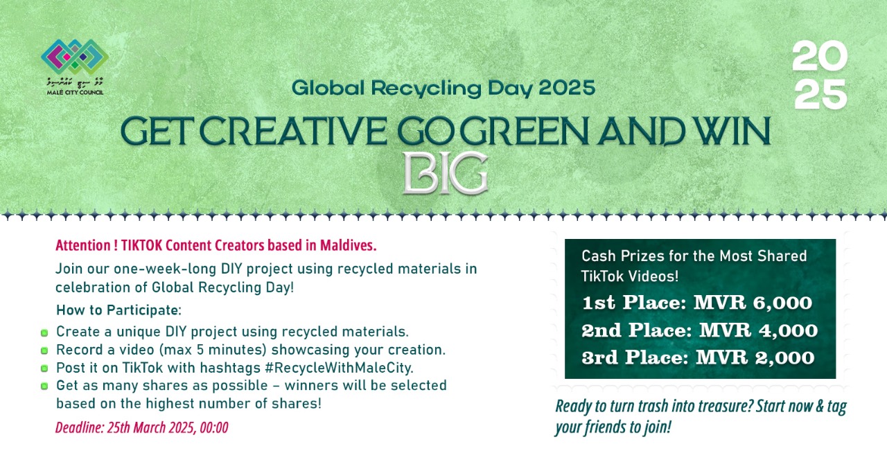ދުނިޔޭގެ ”ރިސައިކްލިންގް ދުވަސް“ ފާހަގަ ކުރުމުގެ ގޮތުން ފެށި މި މުބާރާތަކީ ހަފްތާއެއް ވަންދެން ކުރިއަށްދާ މުބާރާތެއް ކަމުގައި ސިޓީ ކައުންސިލުން ބުނެފައިވެއެވެ.
