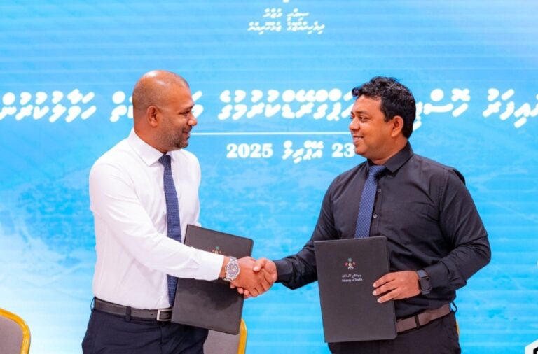 އުނގޫފާރު ރީޖަނަލް ހޮސްޕިޓަލާއި ތިނަދޫ ޑރ. ޢަބްދުއްޞަމަދު މެމޯރިއަލް ހޮސްޕިޓަލް ޓަރޝަރީ ފެންވަރަށް ތަރައްޤީކުރުމުގެ އެއްބަސްވުމުގައި ހެލްތު މިނިސްޓްރީގެ ފަރާތުން ސޮއިކުރެއްވީ ސްޓޭޓް މިނިސްޓަރ އަހުމަދު ގާސިމެވެ. އަދި އެމްޓީސީސީގެ ފަރާތުން ސޮއިކުރެއްވީ މެނޭޖިންގ ޑިރެކްޓަރ، ޑެޕިއުޓީ ކޮމިޝަނަރ އޮފް ޕޮލިސް ރިޓަޔަރޑް އަޙްމަދު ސަޢުދީއެވެ.