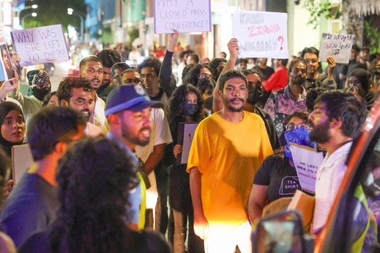 މާލޭގައި ހުންނަ ގެއެއްގެ ފުރާޅެއްގެ މައްޗަށް ވެއްޓުނު 21 އަހަރުގެ އަންހެން ކުއްޖާއަށް އިންސާފު ހޯދައިދިނުމަށް ގޮވާލައި، ގިނަ އަދަދެއްގެ ޒުވާނުން މިރޭ މުޒާހަރާއަށް ނުކުމެއްޖެއެވެ.