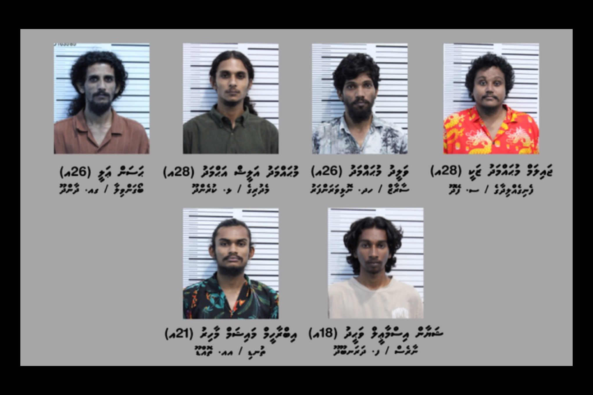 މި މައްސަލައާ ގުޅިގެން ހައްޔަރުކުރެވުނު 6 މީހުންގެ ތެރޭގައި ހިމެނެނީ ގއ. ދާންދޫ / ބޯގަންވިލާ، ޙަސަން ޢަލީ (26އ)، ޅ. ކުރެންދޫ / މެދުރިގެ، މުޙައްމަދު އަލީޝް އަޙްމަދު (28އ)، ހދ. ނޮޅިވަރަންފަރު ސާރާޒް، ވަލީދު މުޙައްމަދު (26އ)، ސ. ފޭދޫ / ފެނިގެއްލިދާގެ، ޖައިލަމް މުޙައްމަދު ޒަކީ (28އ)، ފ. ދަރަނބޫދޫ / ނާރެސް، ޝަޔާން އިސްމާޢީލް ވަޙީދު (18އ) އަދި އއ. ތޮއްޑޫ / ތުނޑި، އިބްރާހީމް މައިޝަމް މާހިރު (21އ)އެވެ.