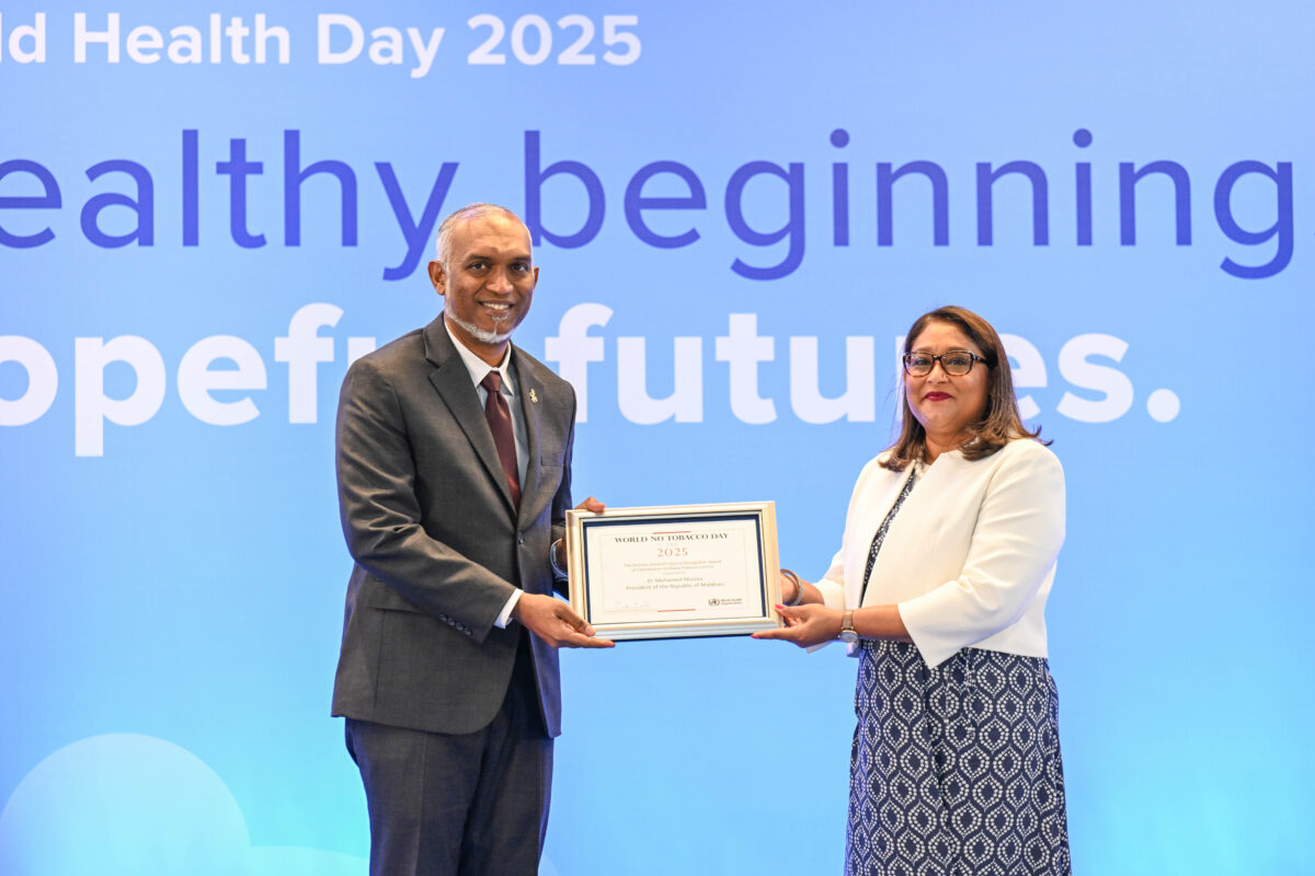 ދިވެހި ރައްޔިތުންގެ ސިއްހަތު ރައްކާތެރިކޮށް، ދުންފަތާއި ދުރު މުޖުތަމައެއް ބިނާކުރުމަށް ރައީސުލްޖުމްހޫރިއްޔާ ޑރ. މުޙައްމަދު މުޢިއްޒު ކުރައްވަމުންގެންދަވާ ހަރުދަނާ މަސައްކަތްޕުޅުގެ އަގު ވަޒަންކުރުމުގެ ގޮތުން، ދުނިޔޭގެ ސިއްހަތު ޖަމިއްޔާ (ޑަބްލިޔުއެޗްއޯ) އިން ޚާއްސަ އެވޯޑެއް ރޭގައި ދެއްވައިފިއެވެ.