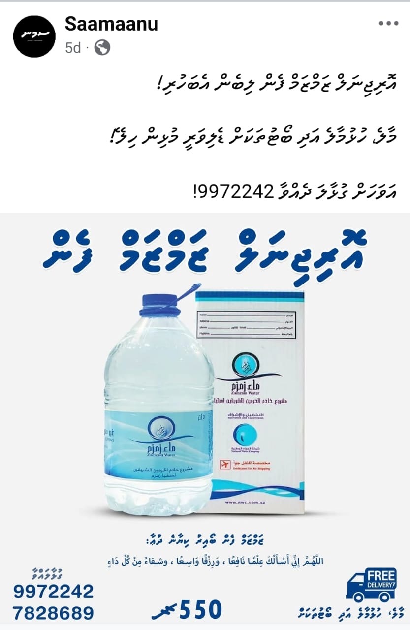 ޔޫއޭއީގައި ހުންނަ ކުންފުންޏަކުން ޒަމްޒަމް ފެން ފުޅީގައި އިސްކުރު ފެން އަޅައި، ރާއްޖޭގައި 550 ރުފިޔާއަށް ވިއްކަމުންދާ ކަމަށް ތުހުމަތުކޮށް މީޑިއާގެ ބޭފުޅަކު އެ މައްސަލަވަނީ ފުލުހުންގެ ސަމާލުކަމަށް ގެނެސްފައެވެ.