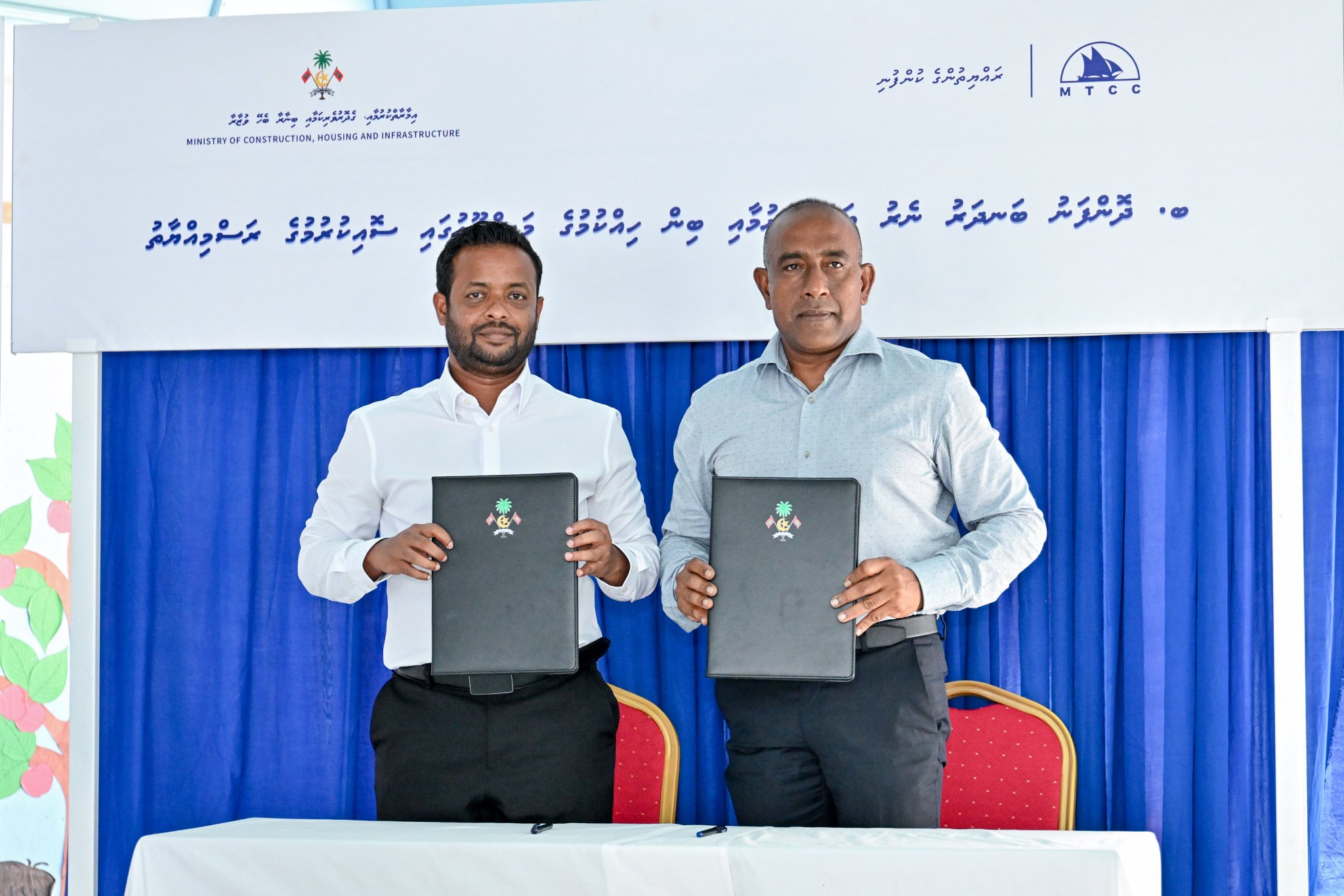 ދޮންފަނު ބިން ހިއްކުމާއި ގޮނޑުދޮށް ހިމާޔަތްކުރުމުގެ މަޝްރޫޢު އެމްޓީސީސީއާ ހަވާލުކުރުމުގެ އެއްބަސްވުމުގައި، ހައުސިން މިނިސްޓްރީގެ ފަރާތުން ސޮއިކުރެއްވީ މިނިސްޓަރު ޑރ. ޢަބްދުﷲ މުއްޠަލިބެވެ. އަދި އެމްޓީސީސީގެ ފަރާތުން ސޮއިކުރެއްވީ އެ ކުންފުނީގެ މެނޭޖިންގ ޑިރެކްޓަރ އަޙްމަދު ސައުދީއެވެ.