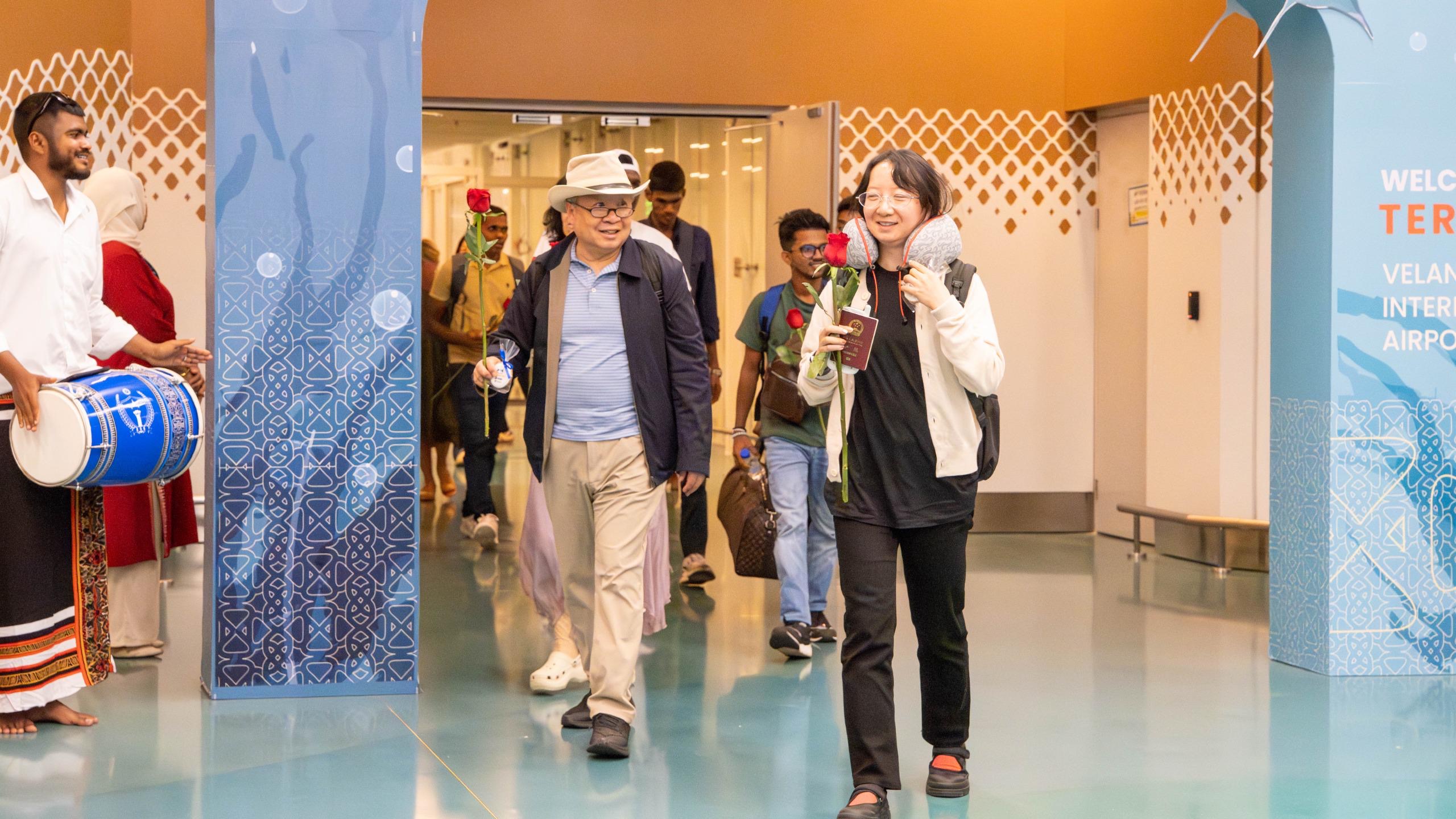 އަދި ޓާމިނަލް 1 އަށް ކައިރި ކުރި ޗޮންޗިން އެއަރލައިންގެ ފުރަތަމަ މަތިންދާ ބޯޓުން ރާއްޖެ އައި 79 ފަސިންޖަރުންނަށް ވަނީ ސަގާފީ ހަރަކާތްތަކާއެކު ހޫނު މަރުހަބާއެއް ކިޔާފައެވެ.