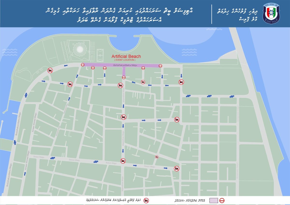 ފުލުހުން މިއަދު ”އެކްސް“ ގައި ބުނެފައިވަނީ މިރޭ އާޓިފިޝަލް ބީޗް ސަރަހައްދުގައި ބޭއްވުމަށް ހަމަޖެހިފައިވާ ހަރަކާތަކާ ގުޅިގެން މިއަދުގެ 18:00 އިން ފެށިގެން ހަރަކާތް ނިމެންދެން އެ ސަރަހައްދުގެ ޓްރެފިކް ފްލޯއަށް ބަދަލު ގެނެވޭނެ ކަމަށެވެ.