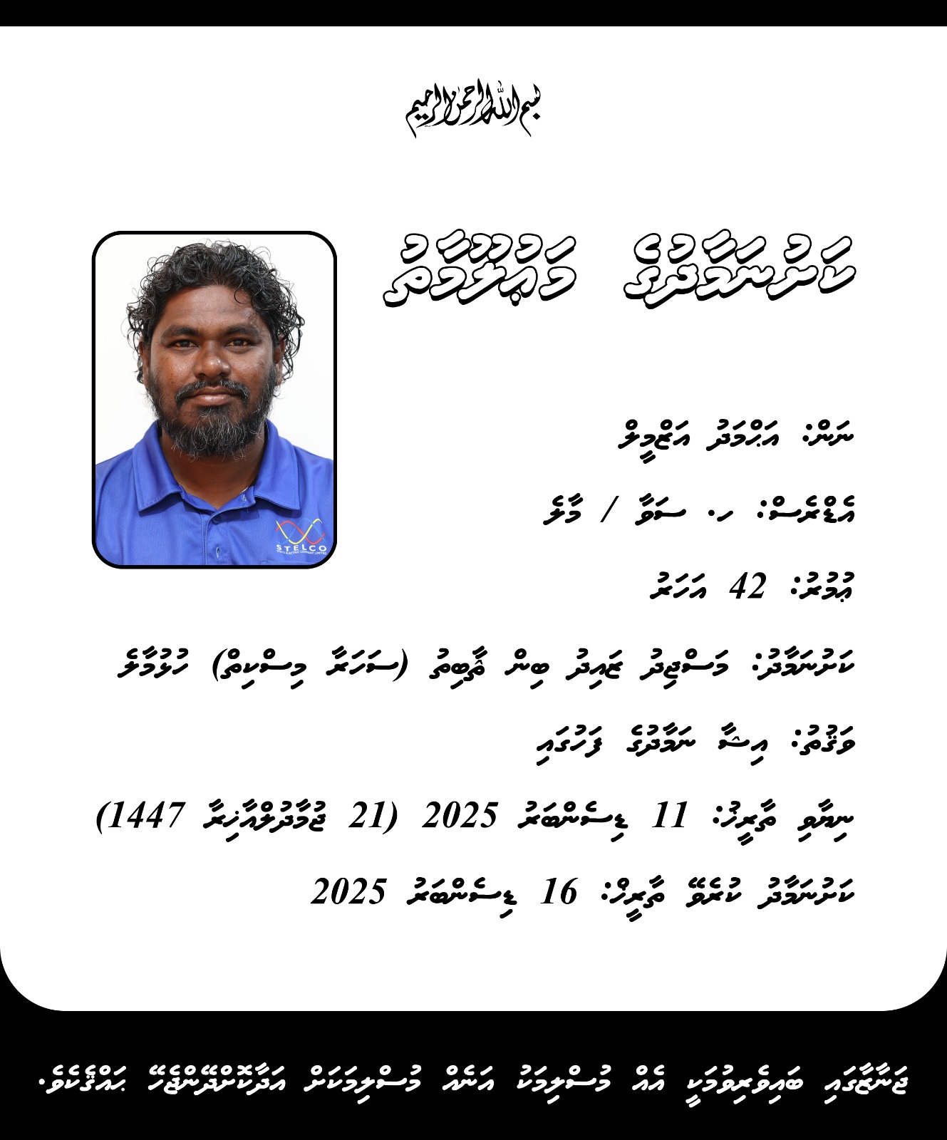 އަލިފާނުގެ ހާދިސާގައި ފިހިގެން ނިޔާވީ ސްޓެލްކޯގެ ސުޕަވައިޒަރެއްގެ ގޮތުގައި މަސައްކަތް ކުރަމުން އައި އުމުރުން 42 އަހަރުގެ އަހުމަދު އަޒްމީލްއެވެ.