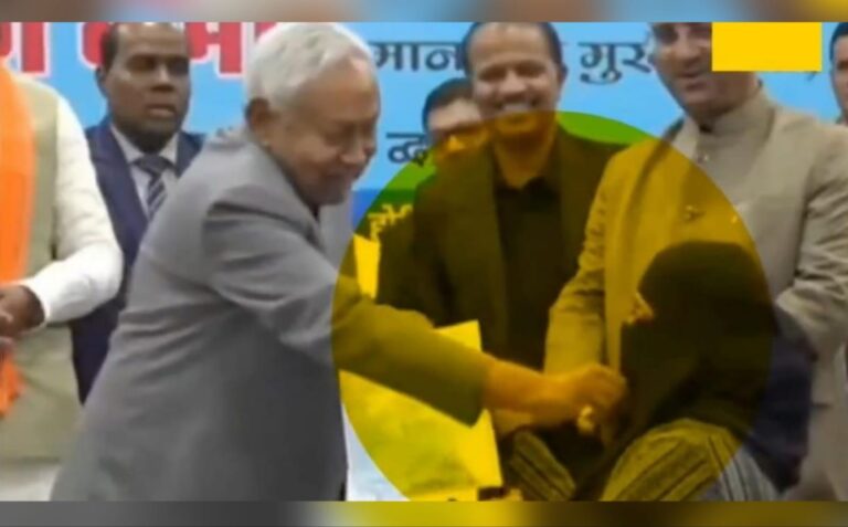 އާޔޫޝް ނަމަކަށް ކިޔައި އެ ހޮސްޕިޓަލާ އަލަށް ގުޅޭ ޑޮކްޓަރުންނަށް ވަޒީފާގެ ސިޓީ ހަވާލު ކުރުމުގެ ރަސްމިއްޔާތު އޮތީ މި މަހުގެ 15 ގައެވެ. އެ ރަސްމިއްޔާތުގެ ޝަރަފުވެރި މެހެމާން އަދި ބިހާރުގެ ޗީޕް މިނިސްޓަރު ނިތީޝް ކުމާރު ވަނީ، މުސްލިމު އެ ޑޮކްޓަރު ކަމަށްވާ ޑރ. ނުސްރަތު ޕަރްވީންއަށް އެ ސިޓީ ހަވާލު ކުރަމުން، އޭނާ އަޅައިގެން ހުރި މޫނު ބުރުގާ ތިރިއަށް ދަމާލައި އެންމެންނަށް މޫނު ހާމަ ކޮށްފައެވެ.