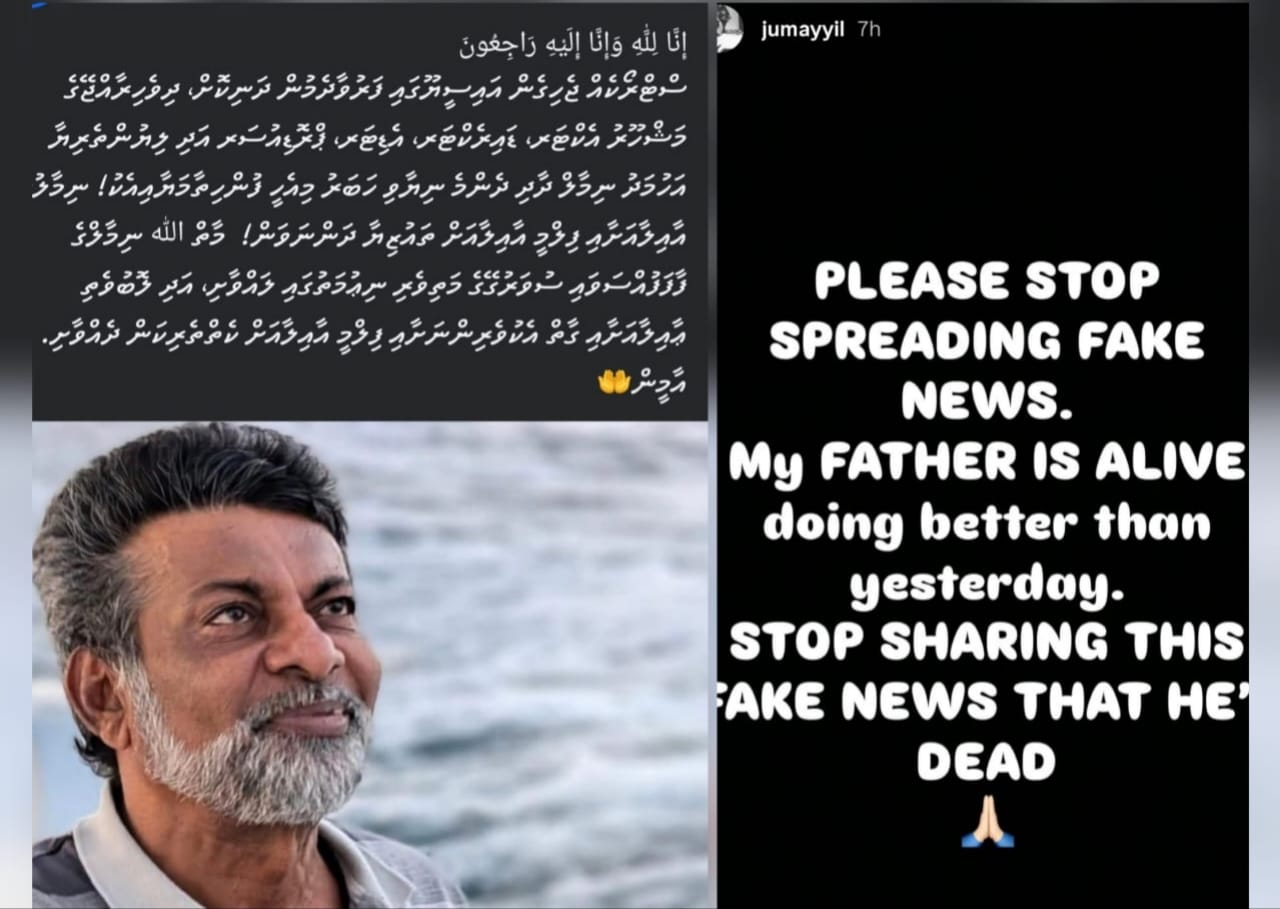 އެ ވާހަކަތަކަށް ރައްދުދެމުން ޖުމައްޔިލް އޭނާގެ އިންސްޓަގްރާމް ސްޓޯރީގައި ރޭގައި ބުނެފައިވަނީ، އޭނާގެ ބައްޕަ މަރުނުވާ ކަމަށާއި އޭގެ ކުރީ ދުވަހަށްވުރެ މިހާރު ނިމާލްގެ ހާލުވެސް ރަނގަޅުވަމުން އަންނަ ކަމަށެވެ. އަދި ދޮގު ވާހަކަ ނުފެތުރުމަށް ވެސް ޖުމައްޔިލް އެދިފައިވެއެވެ.