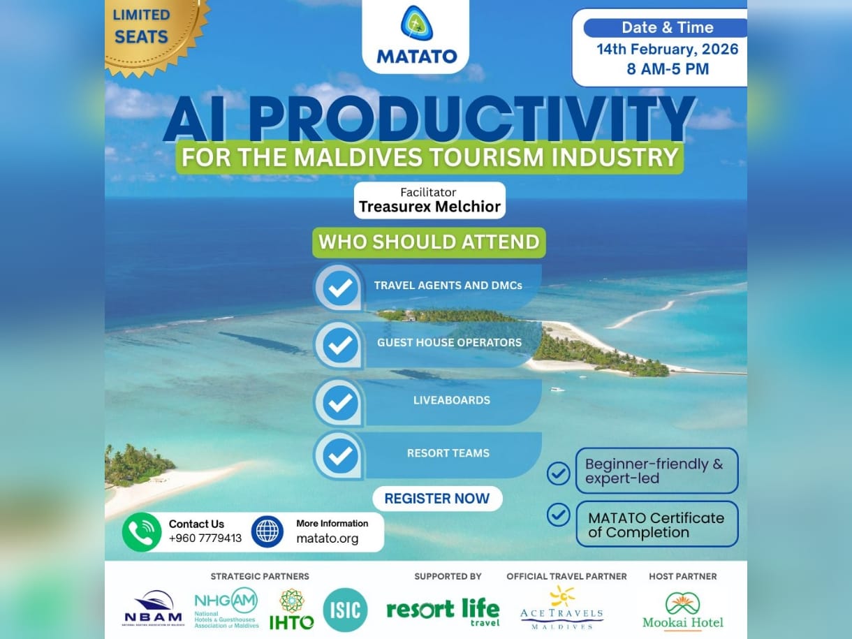 އުފެއްދުންތެރި ނަޒަރަކުން އޭއައި ބޭނުންކުރަން ދަސްކޮއްދޭ ވޯކްޝޮޕެއް މޯލްޑިވްސް އެސޯސިއޭޝަން އޮފް ޓްރެވަލް އެޖެންޓްސް އެންޑް ޓުއަރ އޮޕަރޭޓަރސް (މަޓާޓޯ)ގެ ފަރާތުން ބޭއްވުމަށް ނިންމައިފިއެވެ.