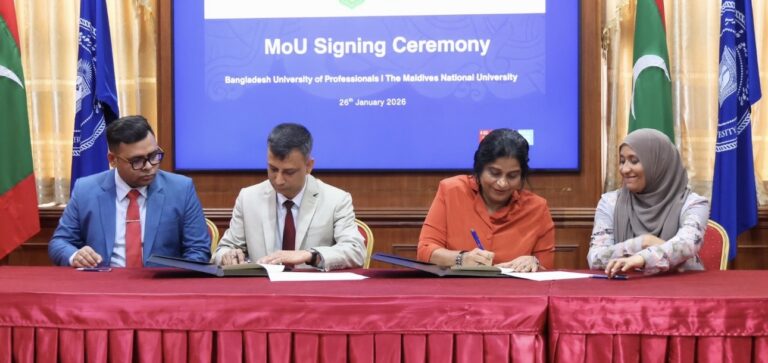 މަތީ ތަޢުލީމުގެ ދާއިރާއިން ގުޅުން ބަދަހިކުރުމަށާއި އެކި ދާއިރާތަކުން އެއްބާރުލުން ދިނުމާ ގުޅޭގޮތުން ދިވެހިރާއްޖޭގެ ޤައުމީ ޔުނިވަރސިޓީ (އެމްއެންޔޫ) އާއި ބަންގްލަދޭޝް ޔުނިވަރސިޓީއާ ދެމެދު މުހިންމު އެއްބަސްވުމެއްގައި ސޮއިކޮށްފިއެވެ.