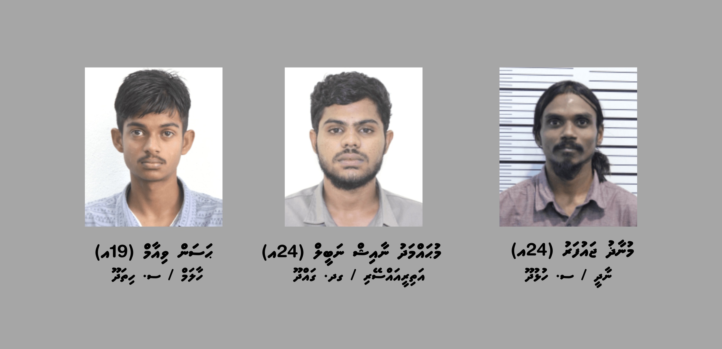 މި މައްސަލައާ ގުޅިގެން ހައްޔަރުކޮށްފައިވަނީ ސ. ހުޅުދޫ / ނާދީ، މުނާޛު ޖައުފަރު (24އ) އާއި ގދ. ގައްދޫ / އަތިރީއައްސޭރި، މުޙައްމަދު ނާއިޝް ނަބީލް (24އ) އާއި ސ. ހިތަދޫ / ހާލަމް، ޙަސަން ވިއާމް (19އ) އެވެ.
