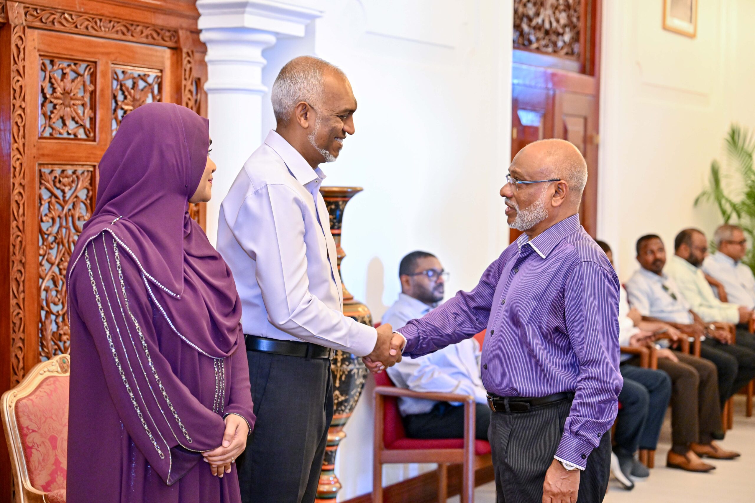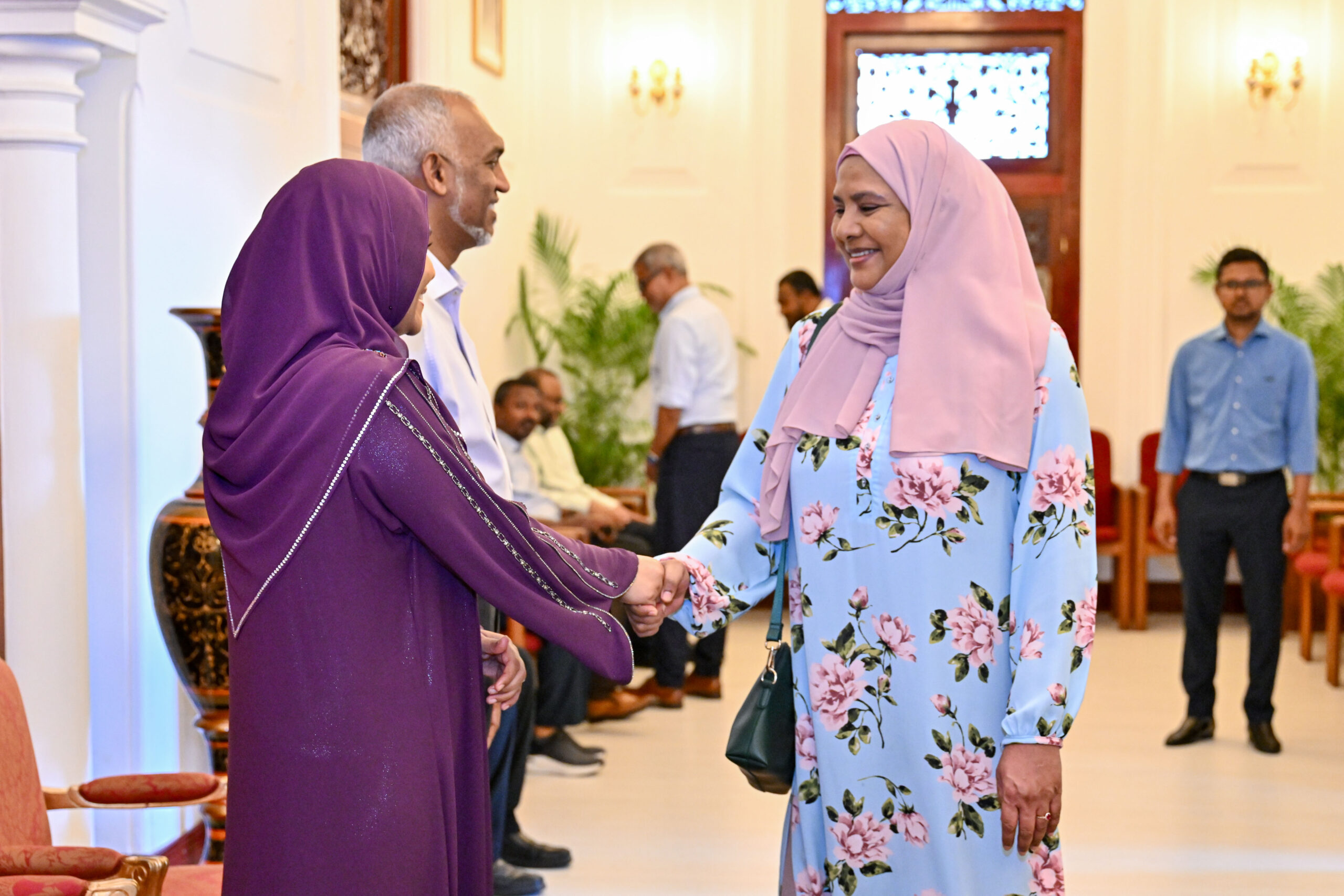 ފިތުރު އީދުގެ އުފާވެރި މުނާސަބަތުގައި ރައީސުލްޖުމްހޫރިއްޔާ ޑރ. މުހައްމަދު މުއިއްޒާއި އެމަނިކުފާނުގެ އަނބިކަނބަލުން ފަސްޓް ލޭޑީ ސާޖިދާ މުހައްމަދާ ބައްދަލުކޮށް، އީދު ސަލާމްކުރުމަށް މިއަދު ހެނދުނު މުލިއާގެ ކައިރިއަށް ގިނަ އަދަދެއްގެ ރައްޔިތުން ހާޒިރުވިއެވެ.
