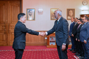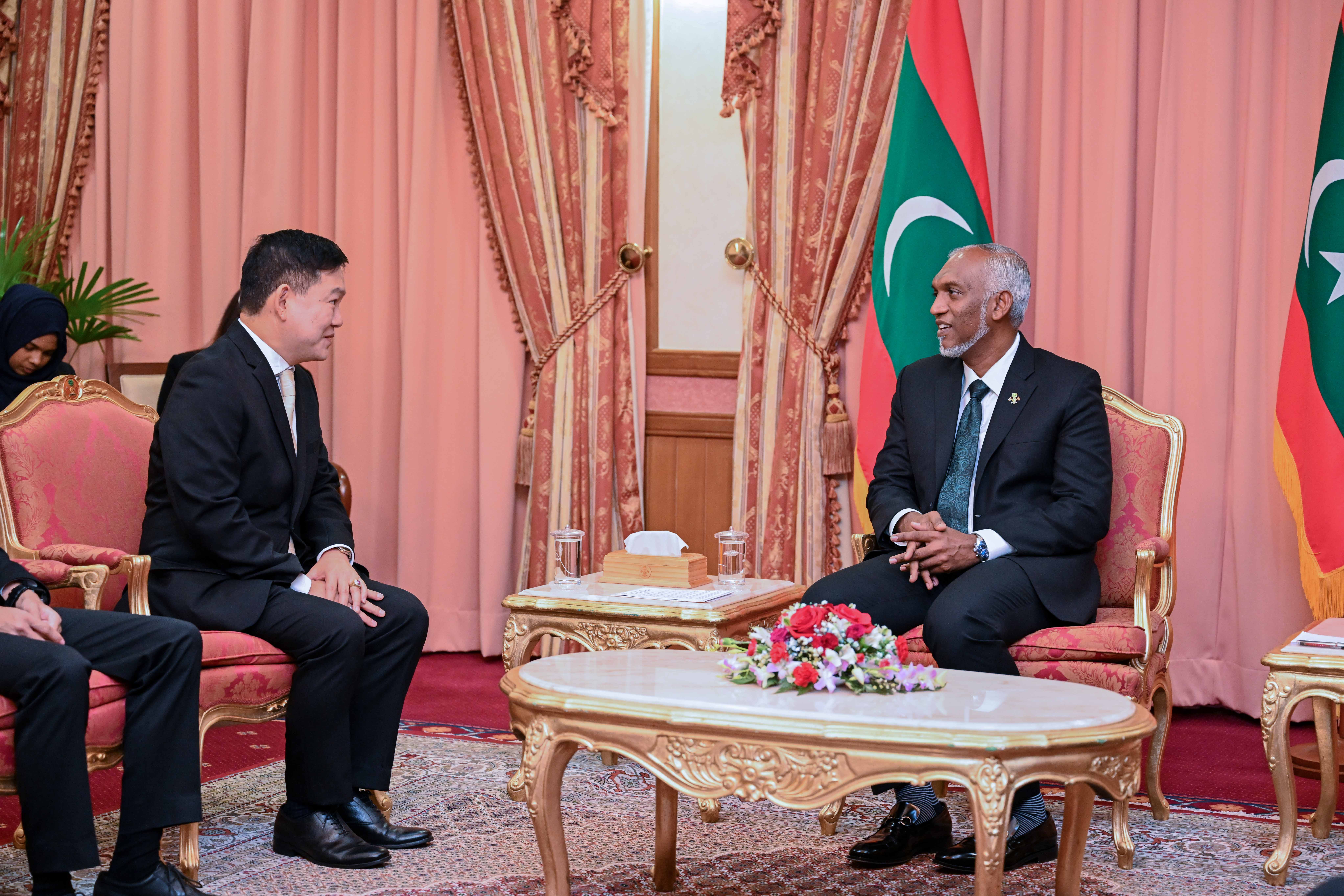 ތައިލެންޑްގެ ސަރުކާރުން ދިވެހިރާއްޖެއަށް ކަނޑައެޅުއްވި އައު ސަފީރު، ޕައިޓޫން މަހާޕަންނާޕޮން އެމަނިކުފާނުގެ ސަފީރުކަމުގެ ފަތްކޮޅު ރައީސުލްޖުމްހޫރިއްޔާ ޑޮކްޓަރ މުޙައްމަދު މުޢިއްޒުއަށް އެރުވީ، މިއަދު ހެނދުނު ރައީސުލްޖުމްހޫރިއްޔާގެ އޮފީހުގައި ބޭއްވި ރަސްމިއްޔާތެއްގަ އެވެ. ފަތްކޮޅާއި ހަވާލުވެވަޑައިގެންނެވުމަށްފަހު ރައީސުލްޖުމްހޫރިއްޔާ ވަނީ އައު ސަފީރަށް ތަހުނިޔާ ވިދާޅުވެ، ދިވެހިރާއްޖެއަށް ވަޑައިގެންނެވިކަމަށްޓަކައި މަރްޙަބާ ވިދާޅުވެފަ އެވެ.